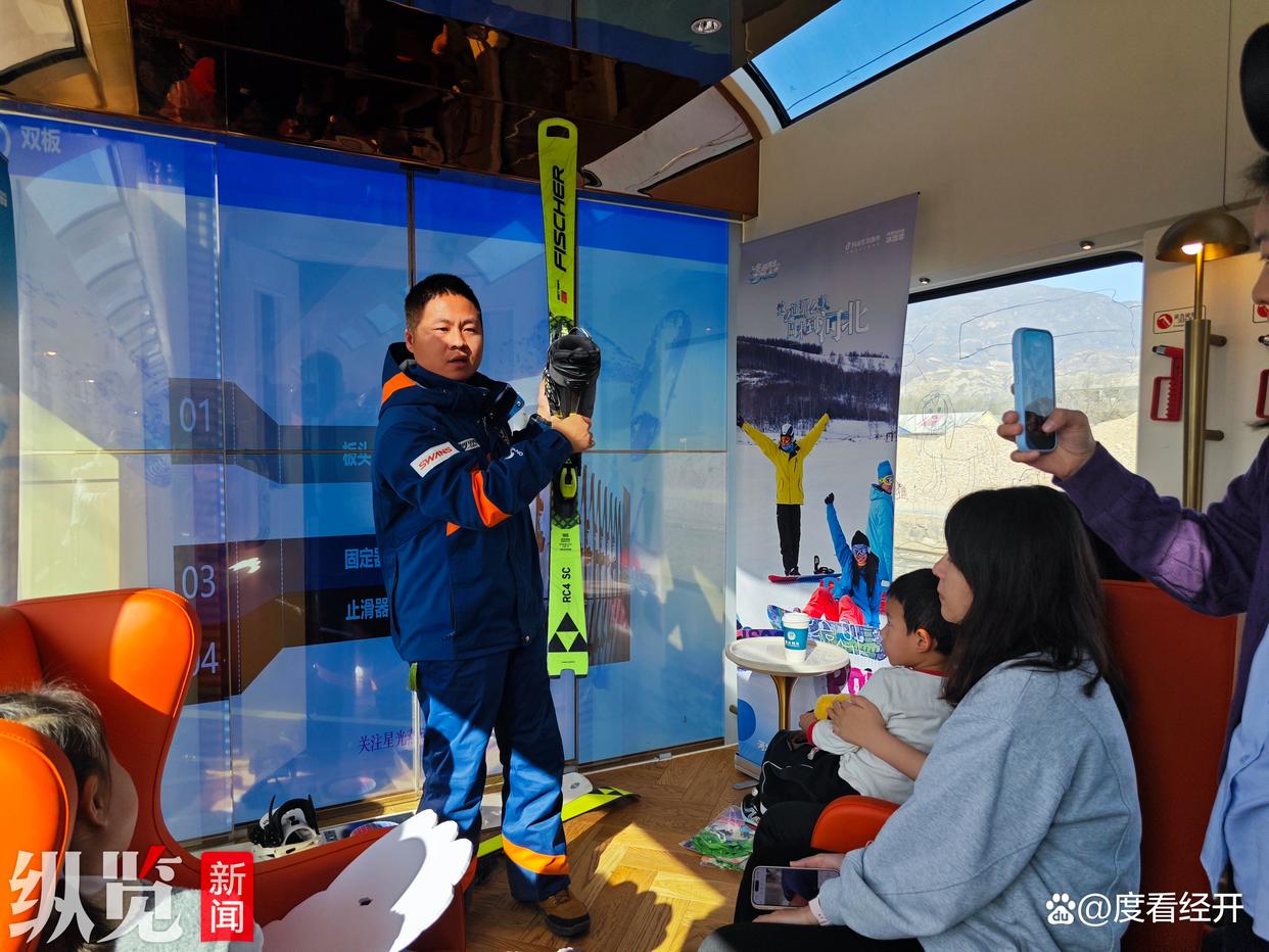 在多功能娱乐车厢,小朋友们用彩色马克笔在车窗上绘画,还有黏土手作等活动吸引了众多家庭参与。孩子们在家长的陪伴下尽情发挥想象力,创作出一个个充满童趣的作品。随着广播声响起,“滑雪公开课”开课了,专业教练拿着滑雪装备,认真地讲解滑雪基础知识和技巧,让游客抵达雪场前就能提前“热身”,体验到冰雪运动的乐趣。