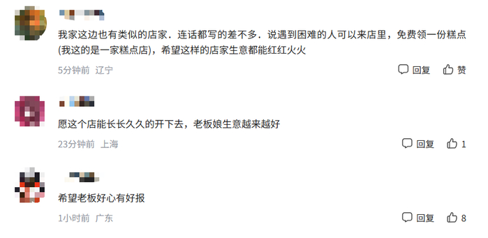 对此,不少网友表示希望老板好心有好报。生意越来越好。有网友表示自己家附近也有类似的店家,遇到困难可以免费领一份糕点。